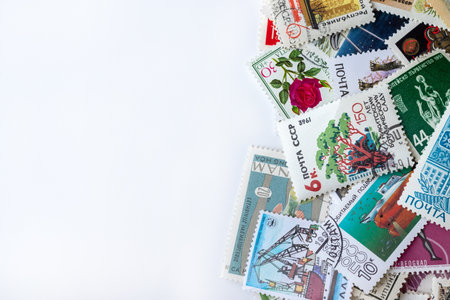 Multicolored postage stamps collection from different countries on white background