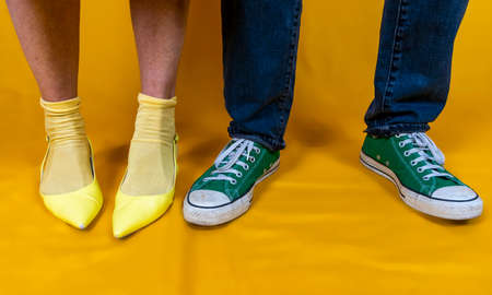 Young persons wearing colorful sneakers and jeans outdoors with copy space - Trendy canvas shoes on the sidewalk - People with casual footwear and denim pants
