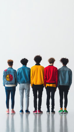 Five individuals stand in a minimalist setting, facing away. They wear colorful clothing, reflecting their unique styles. The bright, empty background enhances their presence and friendship.