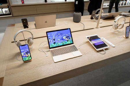 Berlin, August 29, 2018: The buyer looks to buy a new modern iPhone X and installed in it applications with photos or pictures in the official Apple store in Berlin in Germany.