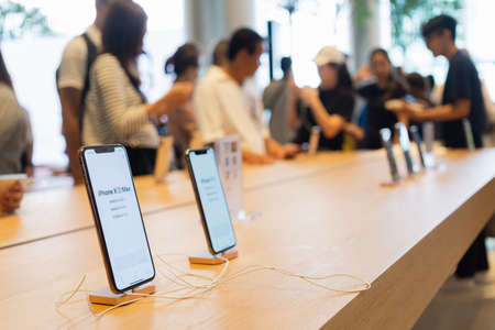 BANGKOK, THAILAND - November 11, 2018: New iPhone XS Max charging in docking station goes on sale in Apple Store at Iconsiam Bangkok Thailand.