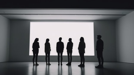 Group of people at exhibition in a museum, back view. Black and white illustration