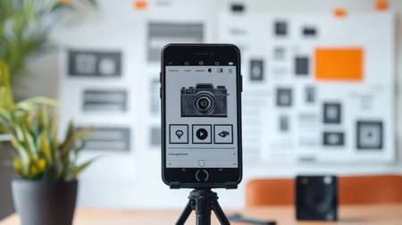 A smartphone mounted on a tripod displays a camera app in a stylish office workspace, showcasing a blend of technology and creativity in a modern setting.