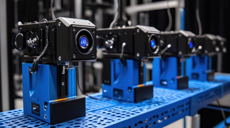 A collection of advanced robotic cameras positioned on blue support stands, showcasing modern technology in an industrial setting focused on innovation.