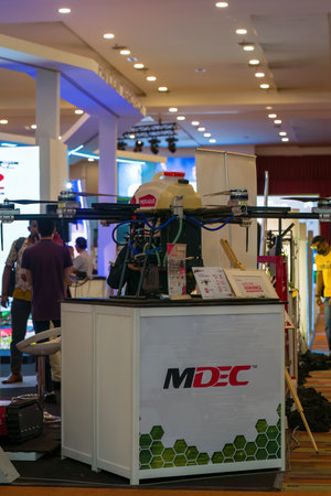 Putrajaya, Malaysia - Aug 10, 2022 Modern technologies in agriculture. An industrial drone was used to spray useful pesticides to increase productivity and destroy harmful insects