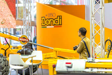 BOLOGNA, ITALY – NOVEMBER 10, 2018: people visiting the fair and shooting photos with camera at EIMA 2018, International Agricultural and Gardening Machinery Exhibition