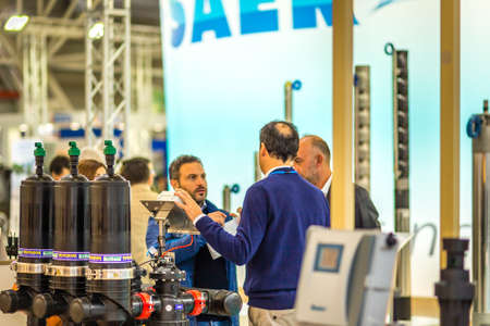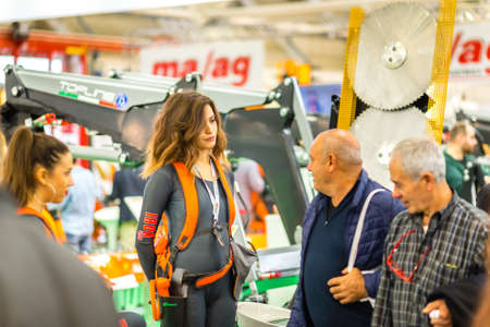 BOLOGNA, ITALY – NOVEMBER 10, 2018: Booth presenter welcoming business visitors at EIMA 2018, International Agricultural and Gardening Machinery Exhibition