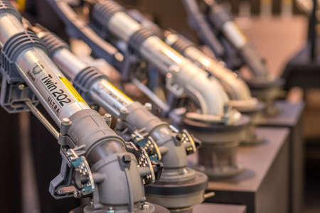 BOLOGNA, ITALY – NOVEMBER 10, 2018: light is enlightening machinery and gears at EIMA 2018, International Agricultural and Gardening Machinery Exhibition