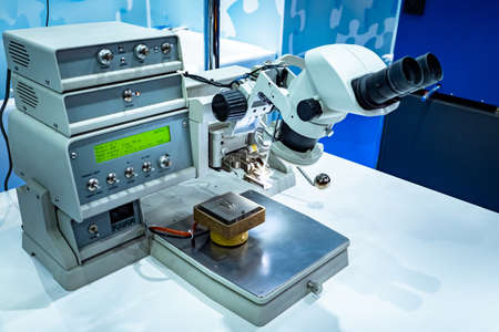 Microscope for PCB examination. Microscope in electro-technical laboratory. Microchip testing equipment. Checking microchips before production. Study microprocessor. PCB testing. Electron microscope