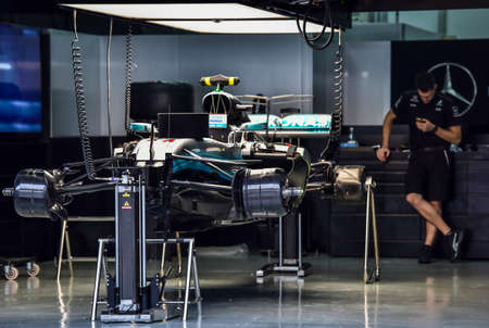 KUALA LUMPUR, MALAYSIA - SEPTEMBER 28, 2017 : Team mechanics work on Mercedes AMG racer Lewis Hamilton's car during Malaysia Formula One Grand Prix at Sepang Circuit.