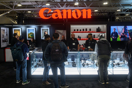 Toronto, ON, Canada - November 6, 2025: Expo attendees browsing cameras and lenses at a technology brand booth, engaging with staff and viewing product displays