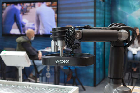 Poznan, Poland 01 Sep 2021: ITM Industry Europe. Robot arm in technology process, automatic industrial robot. ES COBOT - COLLABORATION ROBOT.