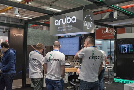 KYIV, UKRAINE - APRIL 06, 2019: People visit Aruba, a Hewlett Packard Enterprise company booth during CEE 2019, the largest electronics trade show of Ukraine in Tetra Pack EC.