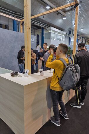 KYIV, UKRAINE - APRIL 06, 2019: People testing professional photographic cameras on Sony company booth during CEE 2019, the largest consumer electronics trade show of Ukraine in Tetra Pack EC.