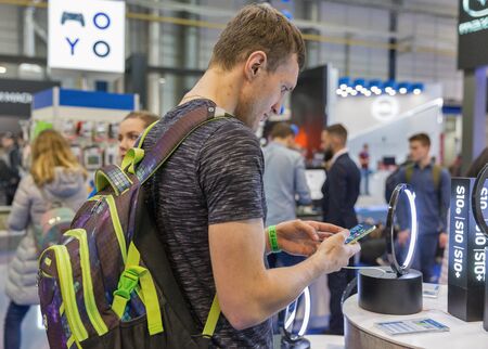 KYIV, UKRAINE - APRIL 13, 2019: People visit Frime, manufacturer of computer equipment and components booth during CEE 2019, the largest electronics trade show of Ukraine in Tetra Pack EC.
