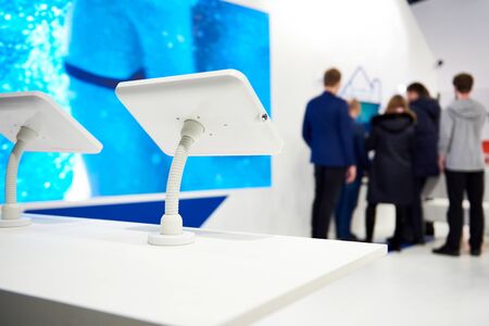 Information touchscreen monitor and businessmen at a modern business exhibition