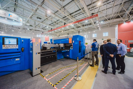 MOSCOW, RUSSIA, Expocentre - MAY 15-19, 2017: 18th international specialized exhibition Equipment, instruments and tools for Metalworking industry. Booth display company. People - visitor event expo.