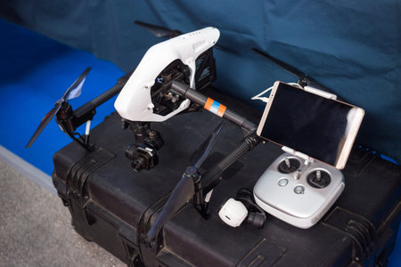 Drone with remote control. Professional quadcopter for making aerial photo at technology exhibition