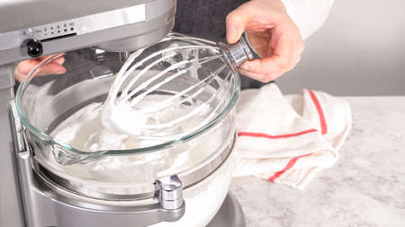 Step by step. Mixing ingredients in kitchen mixer to bake unicorn meringue pops cookies.
