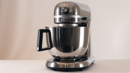 This sleek modern kitchen mixer features a stainless steel bowl and a stylish design, ideal for culinary enthusiasts. Perfect for blending various ingredients smoothly.