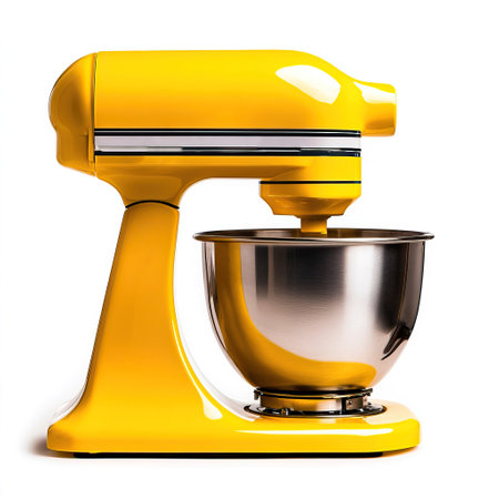 Brightly colored yellow stand mixer with a metal bowl sits against a warm yellow backdrop, symbolizing creativity and joy in baking and cooking activities.
