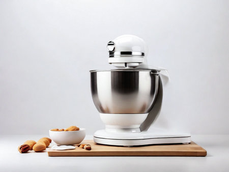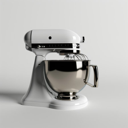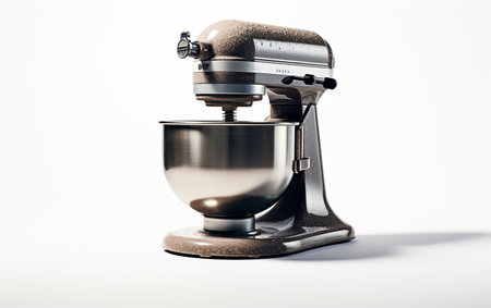 A contemporary kitchen mixer blends ingredients into batter with precision, showcasing a stainless steel bowl in a vibrant kitchen setting. Perfect for home bakers.