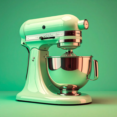 A stylish mint green stand mixer stands ready against a matching background, a symbol of modern culinary creativity.