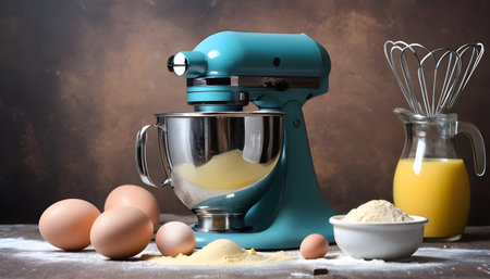 Stand electric mixer with whisk nozzle and ingredients for cake in the kitchen. Kitchen appliances
