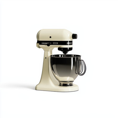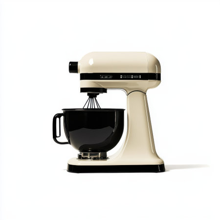 Stylish vintage cream-colored stand mixer with black bowl and whisk attachment on a clean white background for modern kitchen decor