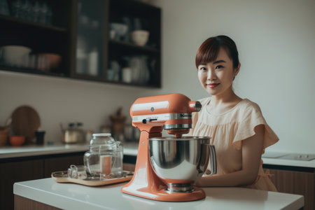 A stylish kitchen mixer stands on a marble countertop next to freshly baked cookies, illuminated by warm sunlight filtering through windows, creating a cozy atmosphere.