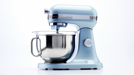 A stylish stand mixer stands on a bright blue background, highlighting its sleek design. Perfect for any kitchen, it offers versatility for all baking needs.