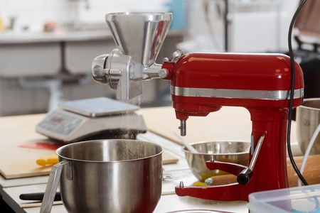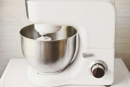 white planetary mixer in the home kitchen. making whipped cream and kneading batter. home baking concept.