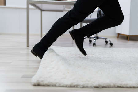 Low Section Of Man Legs Stumbling With A Carpet At Home