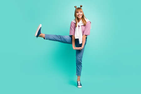 Full size photo of young happy cheerful girl with jumper on shoulders hold hand in air isolated on turuoise color background