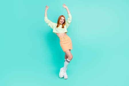 Full length photo of joyful charming young woman good mood raise hands isolated on teal color background