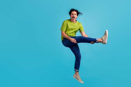 Full length photo of cool funny guy dressed green t-shirt jumping high playing leg guitar isolated blue color background