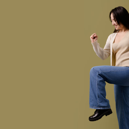 Joyful Woman Dancing With One Leg Raised Against a Blue Background
