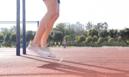 Close-up of a man's legs jumping rope in a park during an outdoor exercise routine