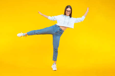 Young woman. Girl stands with her leg raised. Concept - gymnastics. Woman doing gymnastics in casual wear. Cheerful female student on yellow background. Happy woman stands on one leg