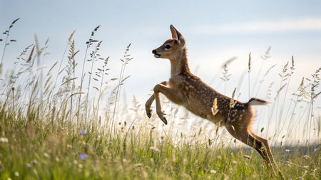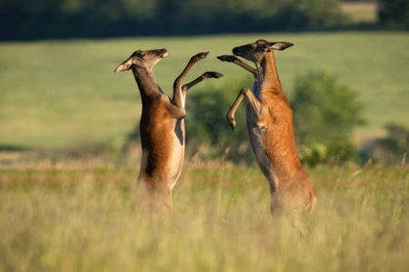 Two red deer, cervus elaphus, fighting on meadow in summertime nature. Pair od hinds standing during duel on grassland in sunlight. Females kicking each other with legs on field.