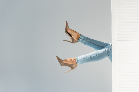 Cropped view of woman in jeans and brown high-heeled shoes on grey background