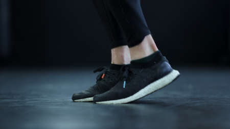 Side view on kickboxer feet at gym. Closeup unrecognizable sportsman jumping in sport club. Unknown fighter using jumping rope in fitness center. Man changing legs in jump in slow motion.