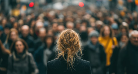 Female figure with wavy blonde hair stands amidst a crowded street, capturing the essence of urban life and the experience of being lost in a sea of people