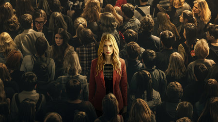 Singular Grace Blonde Woman Standing Out from Large Crowd, Exemplifying Stand Out from the Crowd Concept