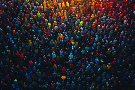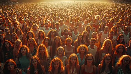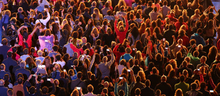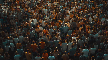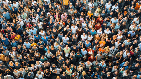 A vibrant aerial view of a large crowd of diverse individuals gathered at an outdoor event. The image captures the essence of unity, celebration, and social interaction.