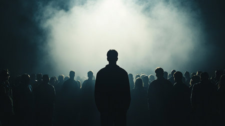 illuminated attractive blonde stands out from a crowd of anonymous people in the shadows