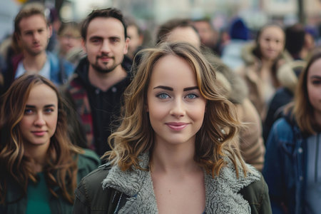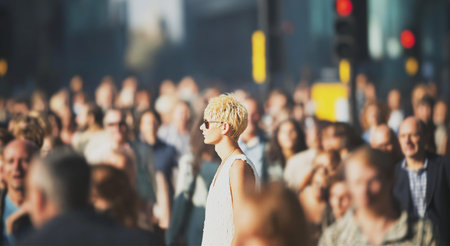 Female figure with long blonde hair stands amidst a bustling crowd in an urban environment, showcasing the vibrancy and diversity of city life and community interaction