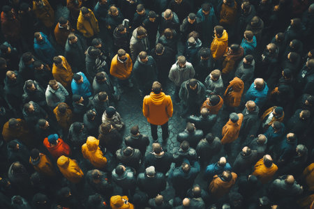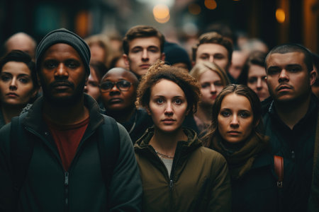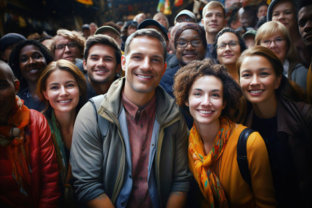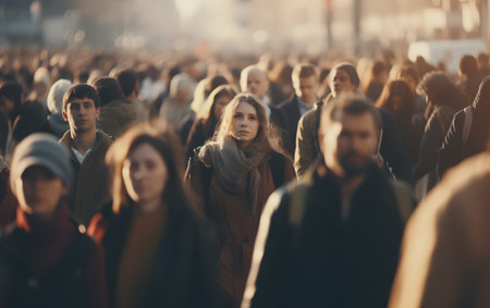 A captivating image showcasing a large crowd in a city, emphasizing the individual at the forefront amidst a sea of faces, creating a unique urban atmosphere.