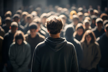 Lone Rebel - A portrait of a solitary figure highlighted amongst a sea of faces, capturing the essence of rebellion and nonconformity in youth culture.