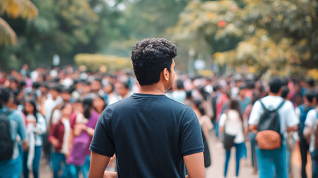 In a bustling outdoor gathering, a young man stands out as he looks up, surrounded by a sea of people. The atmosphere is lively, reflecting engagement and curiosity.